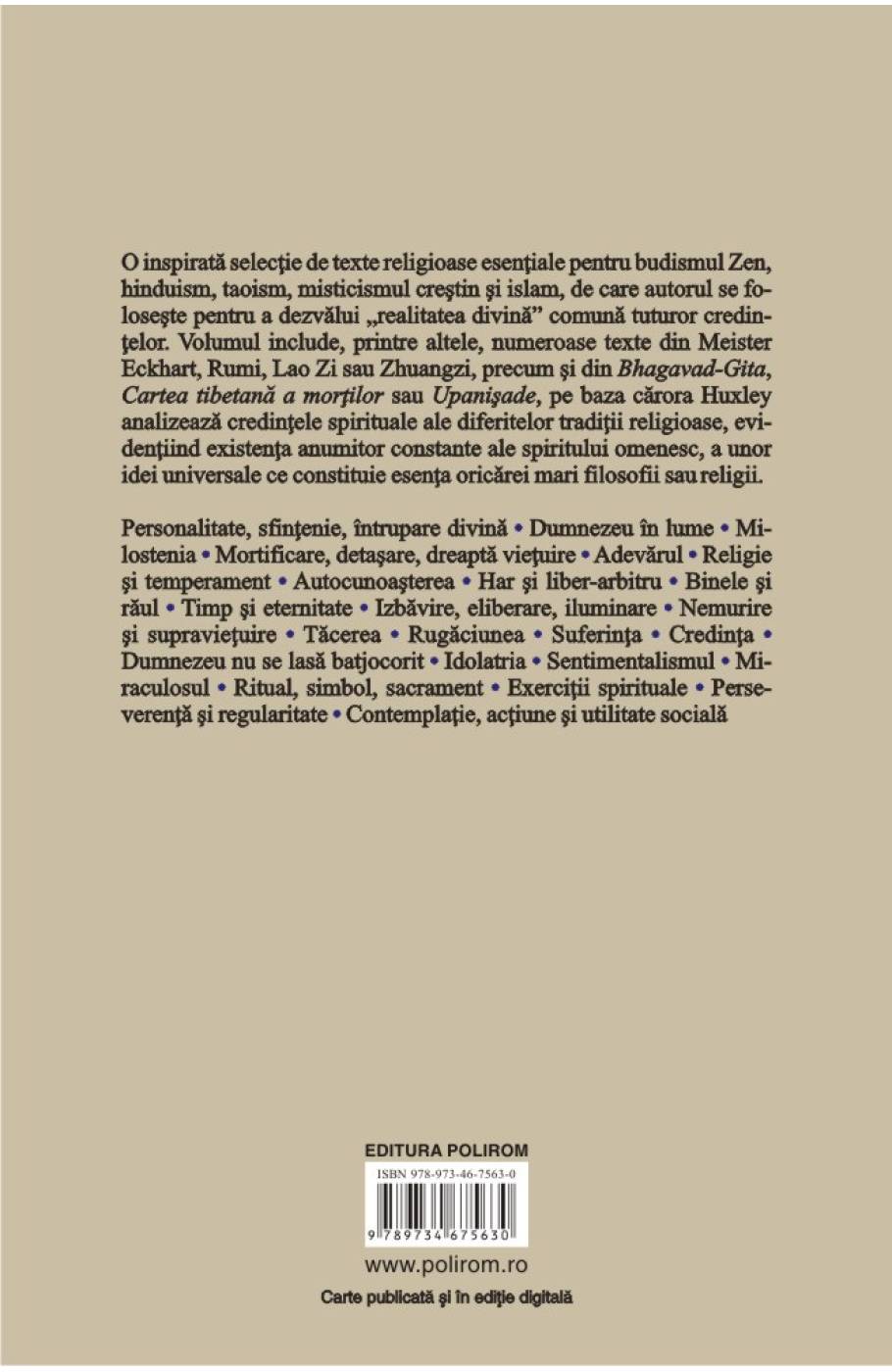 O inspirata selectie de texte religioase esentiale pentru budismul Zen, hinduism, taoism, misticismul crestin si islam, de care autorul se foloseste pentru a dezvalui realitatea divina comuna tuturor credintelor. Volumul include, printre altele, numeroase texte din Meister Eckhart, Rumi, Lao Zi sau Zhuangzi, precum si din Bhagavad-Gita , Cartea tibetana a mortilor sau Upanisade , pe baza carora Huxley analizeaza credintele spirituale ale diferitelor traditii religioase, evidentiind existenta anumitor constante ale spiritului omenesc, a unor idei universale ce constituie esenta oricarei mari filosofii sau religii.
