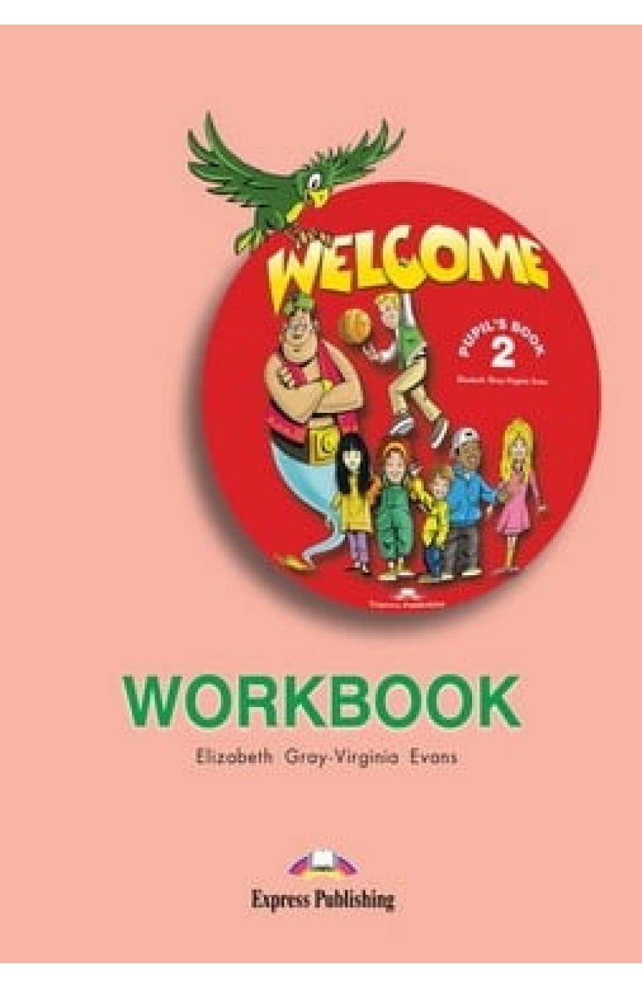 Cartea Welcome 2 Workbook ( caietul de exercitii al elevului) este folosit in general dupa orele de predare din manualul Welcome 2 ca un caiet de teme pentru acasa. Contine o serie de activitati constructive: de desenat, de completat, de descoperit, de asociat etc. axate pe tematica cursului. Caietul de activitati Welcome 2 mai include la sfarsitul acestuia abtibilduri pentru a fi utilizate in cadrul activitatilor si pentru acordarea unor calificative ( foarte bun, excelent, etc.) si o sectiune cu imaginile personajelor scenetei - Pudding Lane - ce pot fi decupate si utilizate pentru a juca o sceneta.